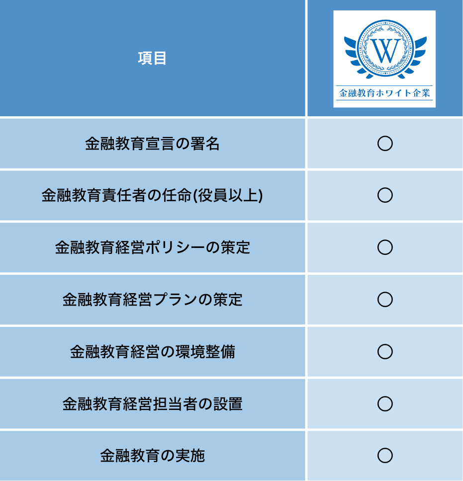 - 私達は従業員の「生涯所得」を増やすことを目指す企業を、金融教育ホワイト企業®として認定します。経営陣が金融教育経営宣言に署名し、従業員が効果的な資産形成に取り組める環境整備に加えて、賃上げや手当などの金銭的支援、良質な金融教育の機会や意思決定・行動支援を行う個別サポートを提供する環境を整備する企業です。この様な取り組みを通じて、従業員の経済的安心感を高め、従業員の経済的幸福(Financial Wellness)の実現を目指す企業を、金融教育ホワイト企業®として認定します。金融教育ホワイト企業®は、物価高時代に従業員が安心して長く働ける企業の証です。