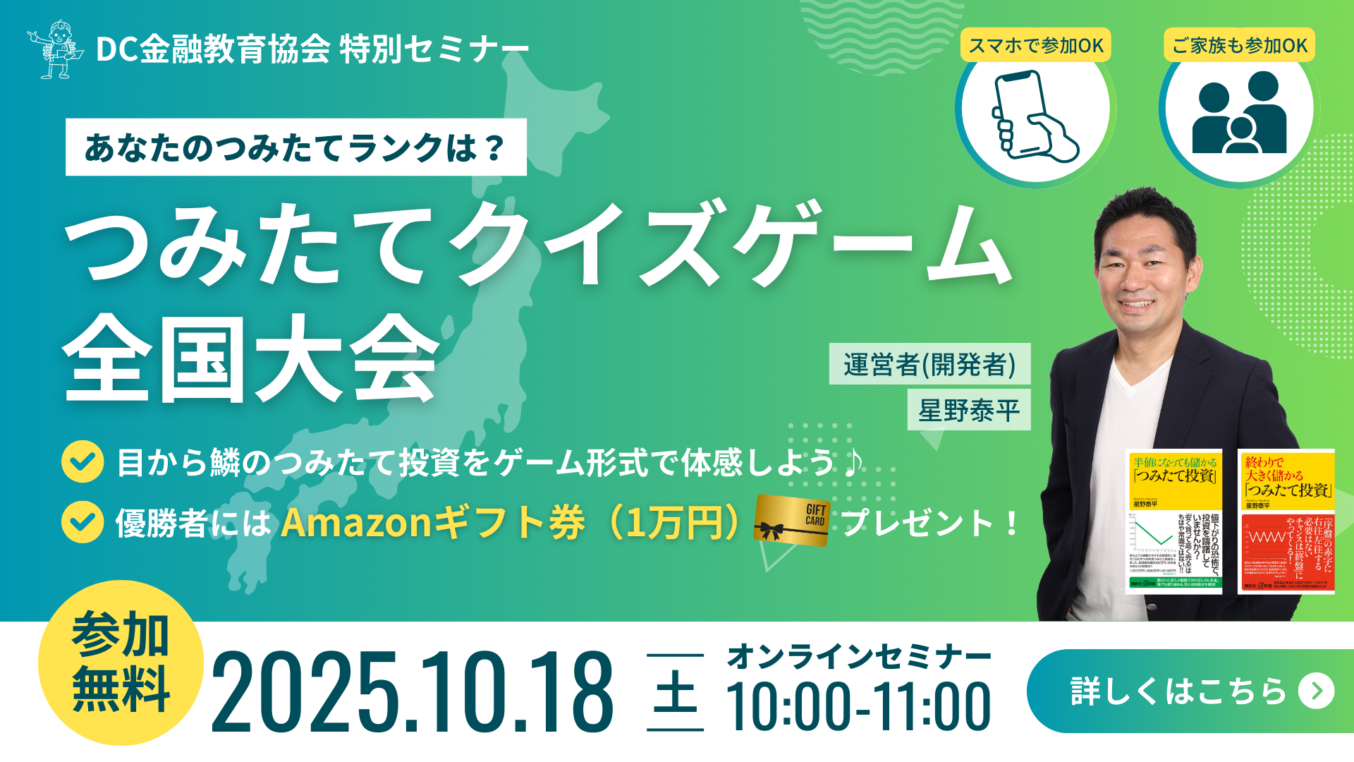 セミナー/イベント【10/18(土)】つみたてクイズゲーム全国大会を開催します2025年10月3日 10/18(土)にオンラインでつみたてクイズゲーム全国大会を行います。 ご参加ご希望の方は、こちらからお申し込みください。 お申込みはこちら