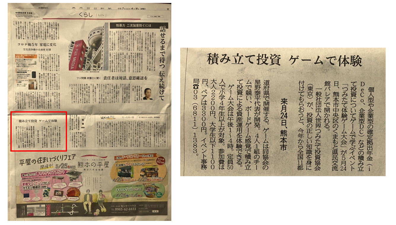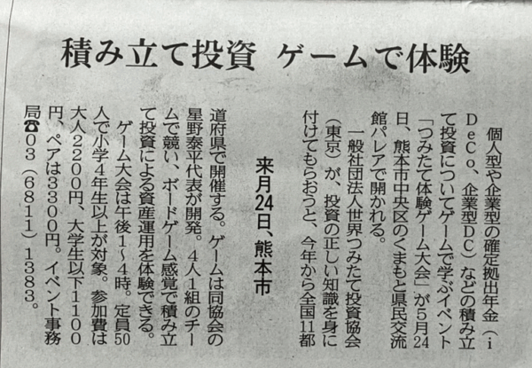 メディア掲載情報【2025年4月18日】熊本日日新聞に開催情報を紹介いただきました2025年4月17日 熊本日日新聞に、つみたて体験ゲーム大会in熊本の開催情報を紹介いただきました。 熊本日日新聞デジタル版のページはこちらからご確認いただけます。