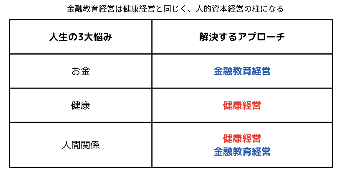 金融教育経営は人間の3大悩みである「お金、健康、人間関係」のうち、主にお金についての悩みを解消する新しい人的資本経営のアプローチです。