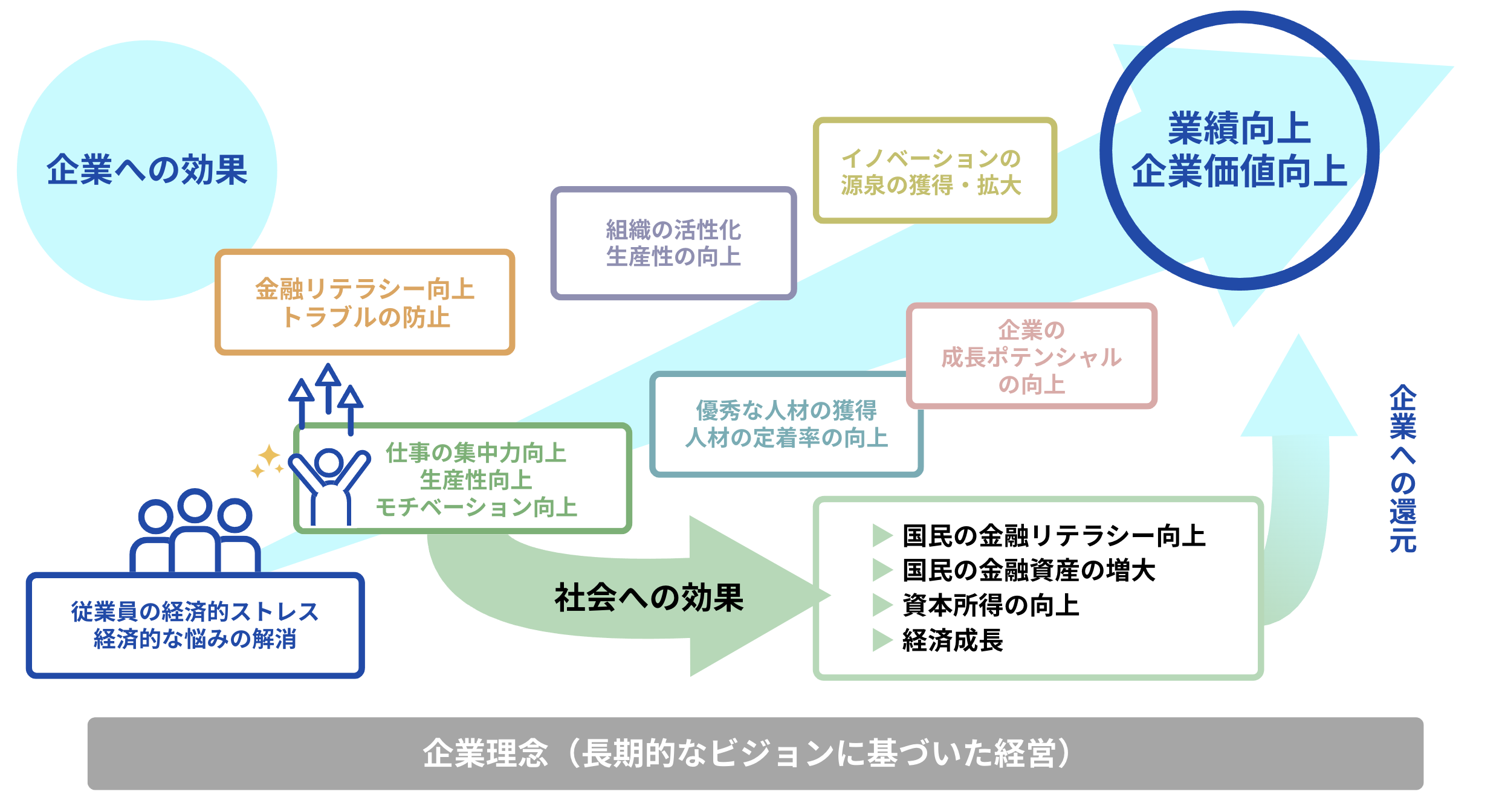 「金融教育経営」は、企業に大きなメリットをもたらします。従業員の集中力向上、ロイヤリティ向上、定着率向上、エンゲージメント向上、生産性の向上につながります。